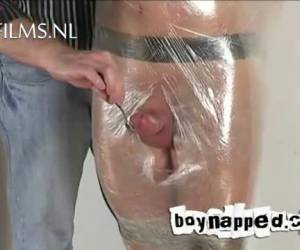 Zijn oudere Meester heeft hem vastgebonden met duct tape. Om zijn lul zit een metalen pijpje. Hij wordt helemaal in folie gewikkeld en moet daarna zn lul op en neer wippen. Met de wheel of pain gaat hij over zijn stijve lul heen en daardoor kost hem aardi