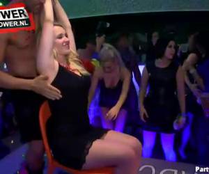 Sommige geile meisjes trekken de stijve lul van de naakte jongens af, op de maat van de muziek.