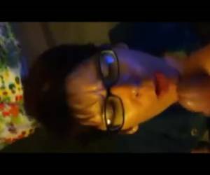 Hij filmt met zijn mobiel hoe de brildragende slet haar tietjes laat zie, waarna de teef zijn dikke lul met twee handen aftrekt en hem pijpt. Dan trekt hij zijn dikke lul af boven haar gezicht, tot hij klaarkomt en zijn hand vol zaad spuit die de hoer afl